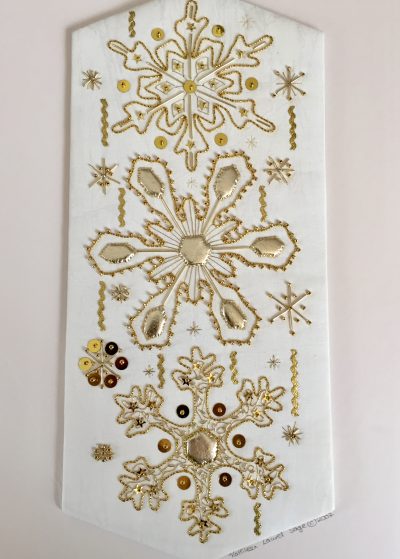 Learm the traditional techniques of couching golden cords and applying gold padded leather to form three stylised snowflakes on a long panel design. Add some purl or check wires , beads and sequins and you will have a beautiful festive panel to display with your festive decs this coming season. If a panel is not for you, why not make three separate snowflakes as tree decorations or greetings cards for special friends . Kit includes enough materials for one panel or three separate snowflakes.